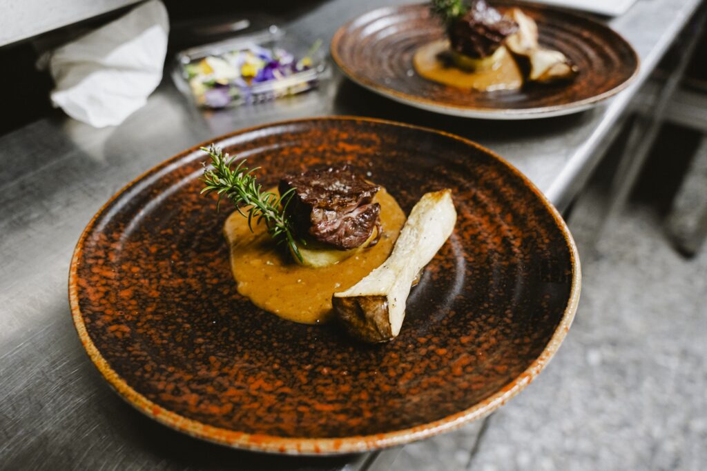 • Lomo de vaca acompañado de papas, salsa de queso y trufa