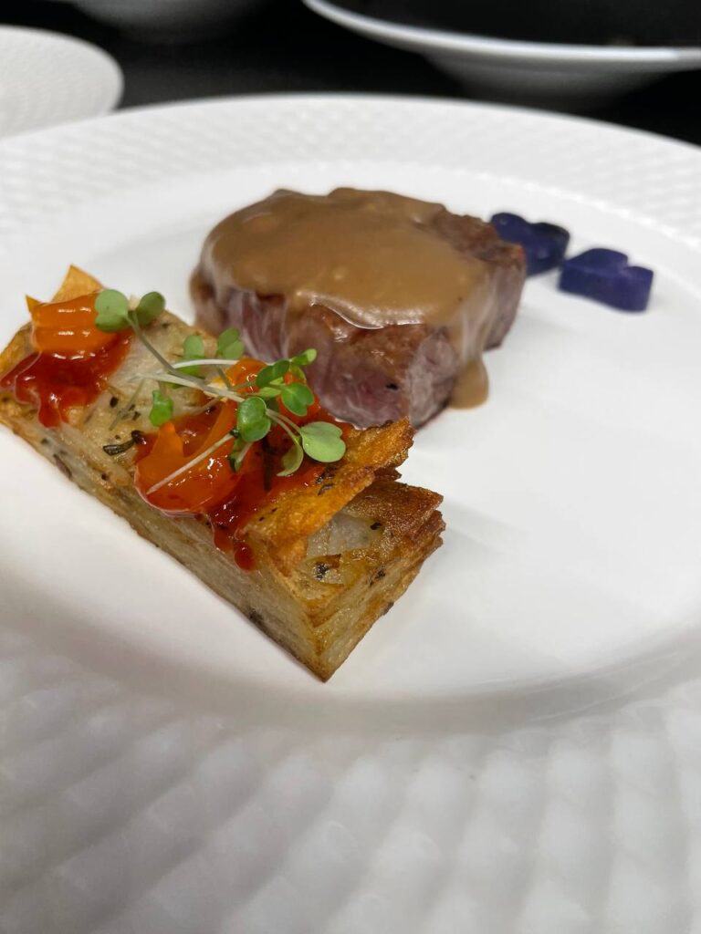 Después, el lomo bajo de vaca, punto perfecto, acompañado de salsa de cebolla y vino tinto, milhojas de papa con sriracha y crema de yemas, coronado con corazón de papa violeta. Aquí el fuego habló claro.