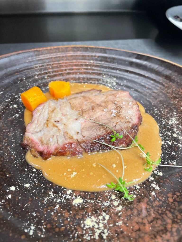 Después llegó una combinación elegante y técnica: yema curada, crema de cordero y papada crujiente. Un plato que jugaba con la untuosidad y el crujiente en equilibrio perfecto.
