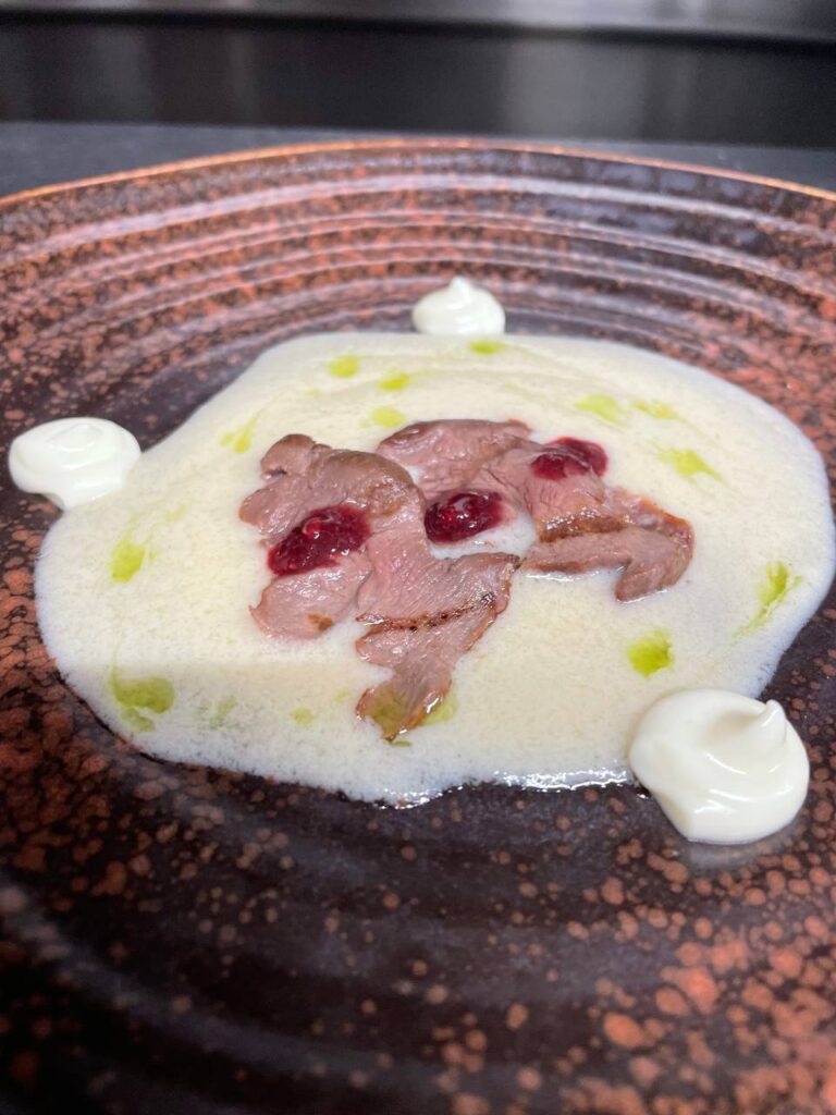 El tercer pase sorprendió por su atrevimiento: salsa blanca, ciervo laminado y salsa de frutos rojos, acompañados de gotas de aceite de albahaca y mahonesa de wasabi. Intensidad, contraste y personalidad.