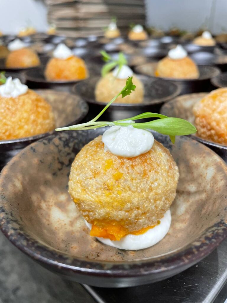 El segundo aperitivo introdujo textura y frescura. Un panipuri crujiente, relleno de batata y acompañado de un yogur cítrico que limpiaba el paladar, con el cilantro aportando ese punto verde que despierta.