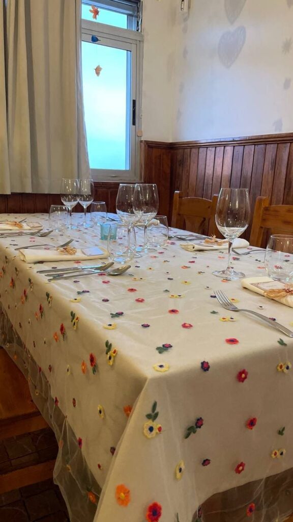 Cada mesa estaba preparada con mimo: servilletas anudadas con cuerda natural, tarjetas personalizadas con el nombre de cada comensal, cristalería impecable y detalles pensados para que cada pareja sintiera que esa mesa era solo suya.